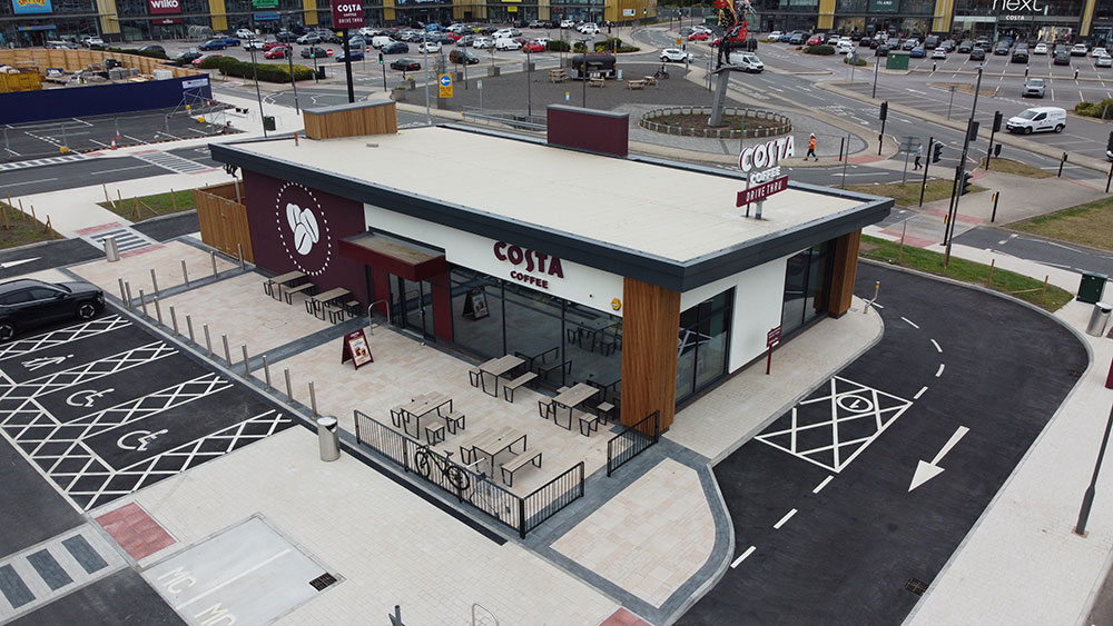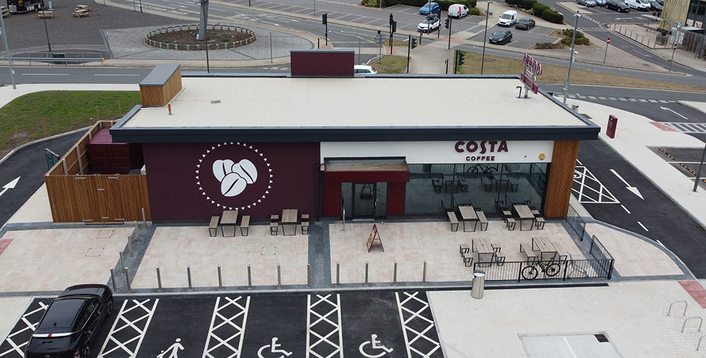 Costa Coffee incorporated the installation of a Kingspan single ply composite roof and a single ply built-up system for the Kiosk and payment booths.