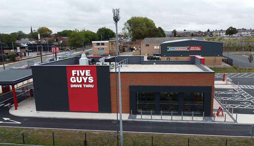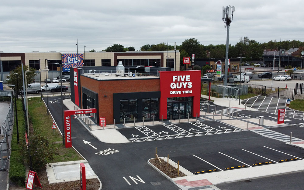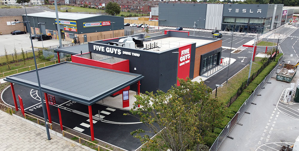 The Five Guys drive-thru includes a Kingspan single ply composite roof along with parapets.